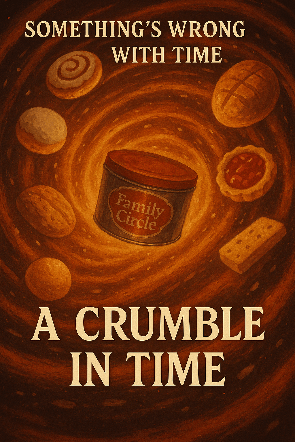 Image Description (cover image): A warm, richly textured illustration shows a glowing Family Circle biscuit tin floating at the centre of a swirling vortex. Around it spin various baked goods — jam tarts, bread rolls, cinnamon buns, shortbread fingers — all being drawn into the jamline spiral. The colours are rich reds, oranges and golden yellows,… Continue reading The Biscuit Detectives – Volume Four – A Crumble In Time – Chapter Seven
