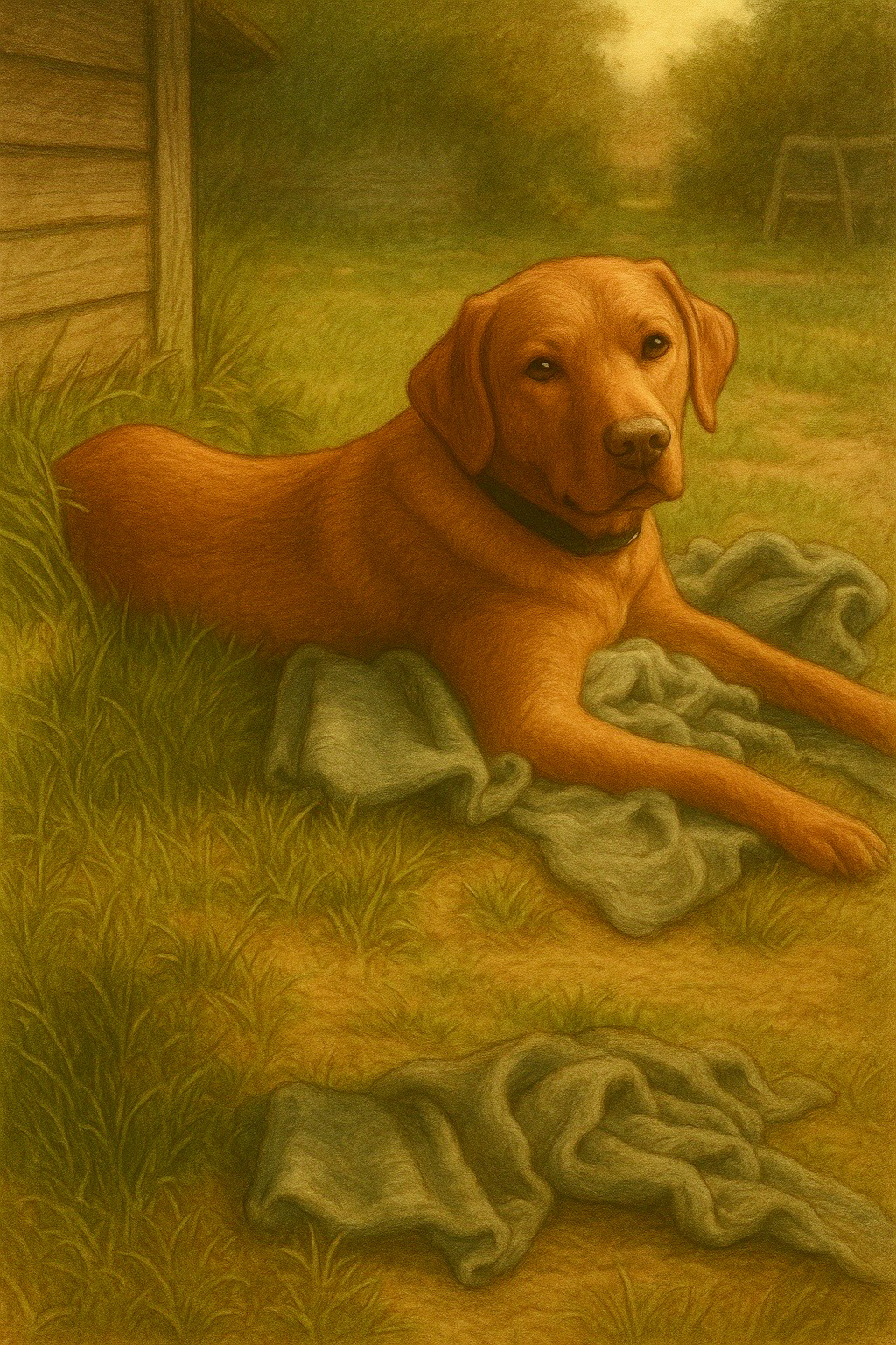 Image Description: A warm-toned, softly illustrated scene of Indy, a fox red Labrador, lying on a patch of grass beside a rustic wooden shed. He’s stretched out comfortably on a crumpled, well-worn blue/grey blanket, with another piece of the blanket trailing in front of him. The fabric is thin, frayed, and full of small holes… Continue reading The Joy of Indy – Biscuit Detectives Diary Entry – 13 August 2025
