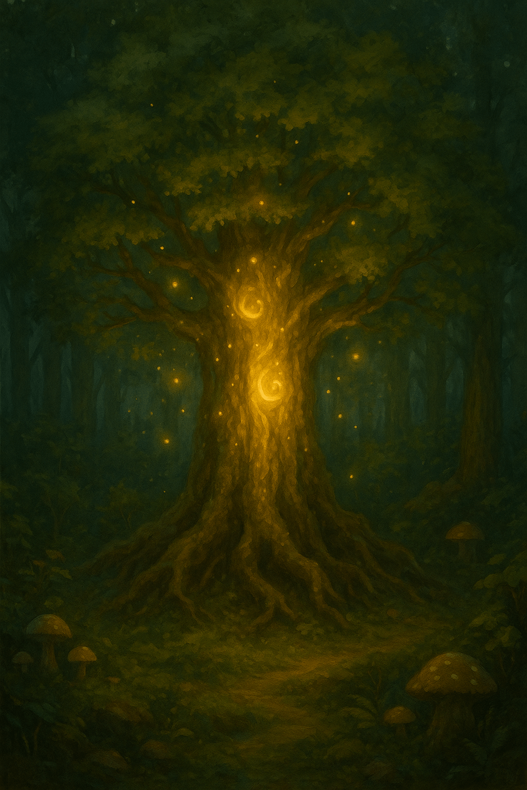 Image Description. A mystical, atmospheric illustration of the Sporalight Tree glowing softly in the heart of a deep, ancient forest. The tree is massive and majestic, with a thick, gnarled trunk that twists slightly as it rises, covered in textured bark that almost appears to ripple with life. Spiralling across its trunk are two luminous… Continue reading The Mushroom Men Of Misilania – Character Bio: The Sporalight Tree